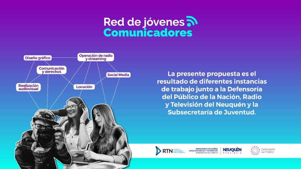El Ministerio de Niñez, Adolescencia y Juventud, a través de la subsecretaría de Juventud y en conjunto con Radio y Televisión del Neuquén ((RTN) y la Defensoría del Público de Servicios de Comunicación Audiovisual, presentaron este miércoles las capacitaciones en comunicación integral que se dictarán a jóvenes comunicadores de la provincia, en el marco de un convenio firmado días atrás.