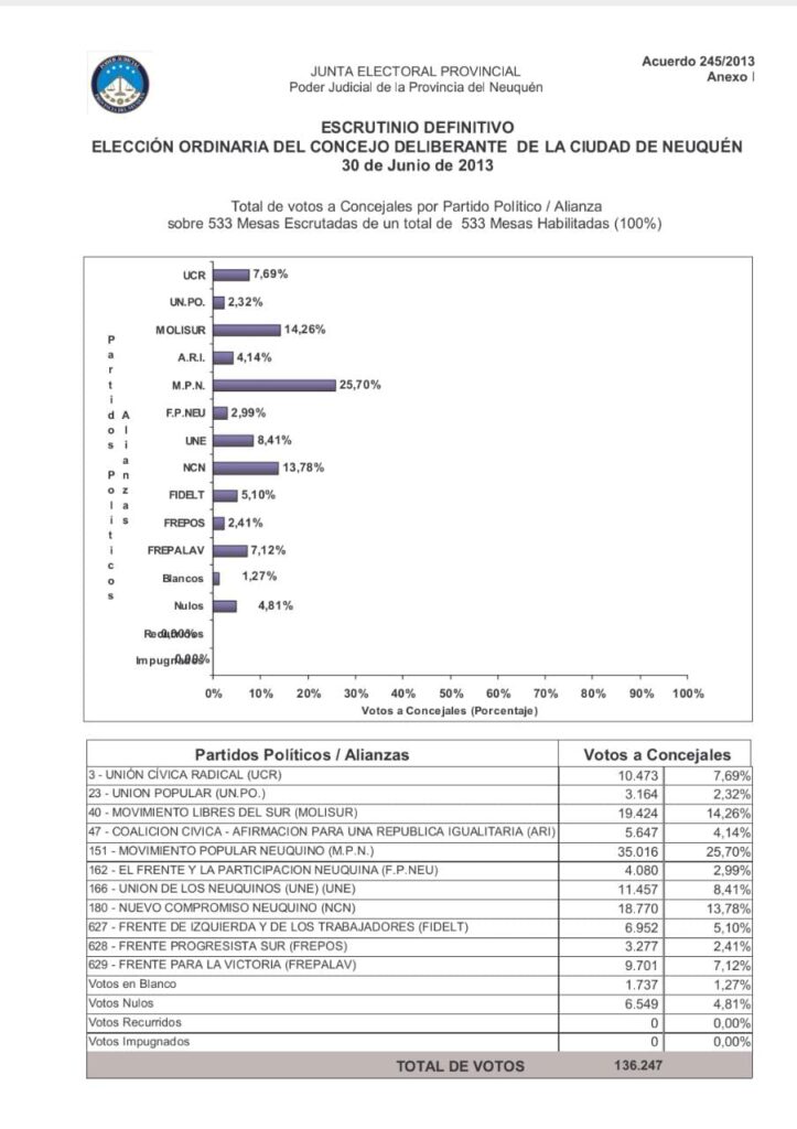 El Movimiento Popular Neuquino (MPN) se impuso este domingo en las elecciones a concejales de la ciudad de Neuquén a través de la lista encabezada por el candidato Claudio Domínguez, que obtuvo el 28,68% de los votos con el 100% de las mesas escrutadas, y además el 65,88% de los electores votó por el «Sí» a la enmienda de la Carta Orgánica.