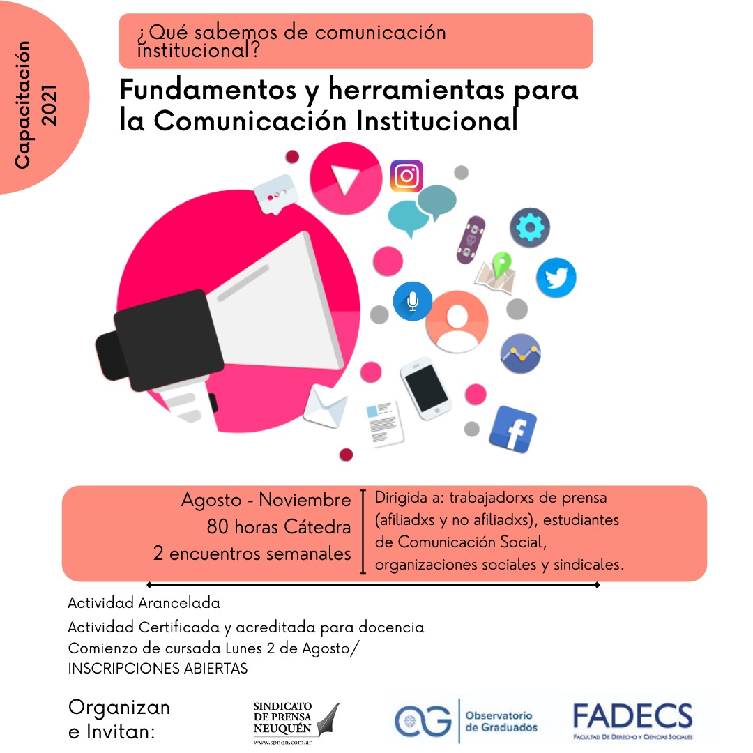 En referencia a las capacitaciones explicó que “A partir del 2 de agosto, en conjunto con la UNCO a través del grupo de graduados y la gente de extensión; se larga un primer curso sobre comunicación institucional. Para nosotros es importante porque buscamos es darle herramientas al trabajador y trabajadora para trabajar en equipo, todo en el área de audiovisual y comunicación, actualizarse y renovarse. Es para quien necesite esta capacitación y que en cuatro meses puede tener un curso de 80 horas catedra avalado por la UNCO y dictado por Nicolás Bustamante”