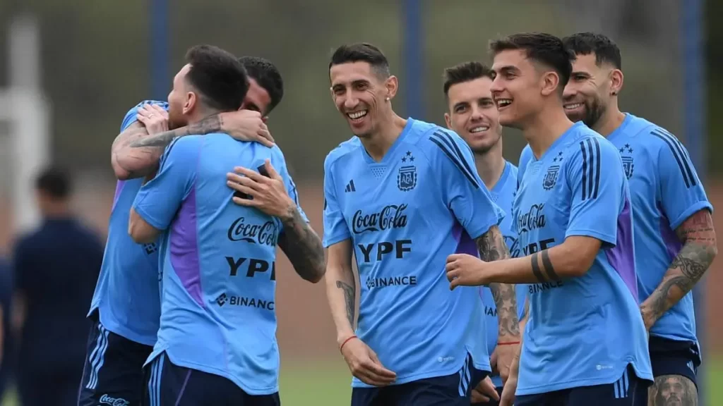 El dato de color de la práctica lo aportó el juvenil delantero de River Claudio Echeverri, quien a instancias de Scaloni pudo saludar a las figuras de la selección y se sumó al trabajo.