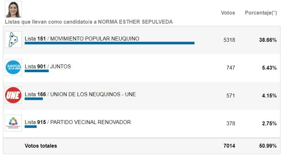 Norma Sepulveda del MPN será reelecta como intendenta de Rincón de los Sauces. Sepulveda obtuvo 7.014 votos, es decir la votaron un 50.99%, mientras que en segundo lugar estuvo César Aurelio Godoy quien tuvo 5.716 votos, es decir, 41.56%.