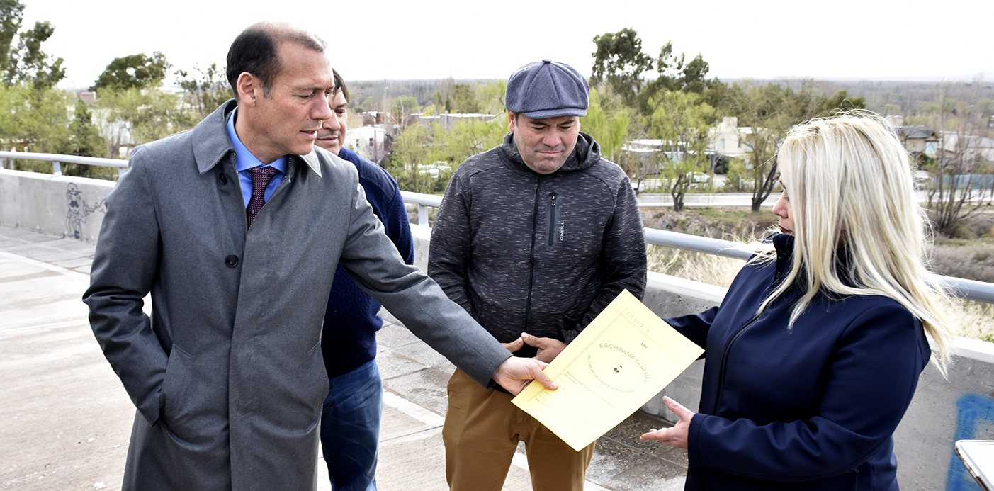 El gobernador Omar Gutiérrez le entregó hoy a la intendenta de Senillosa, Patricia Fernández, la transferencia de 50 hectáreas para avanzar en la regularización de un loteo. Gracias a esta acción, 24 familias se verán beneficiadas pues podrán gestionar la escritura de las tierras que habitan.