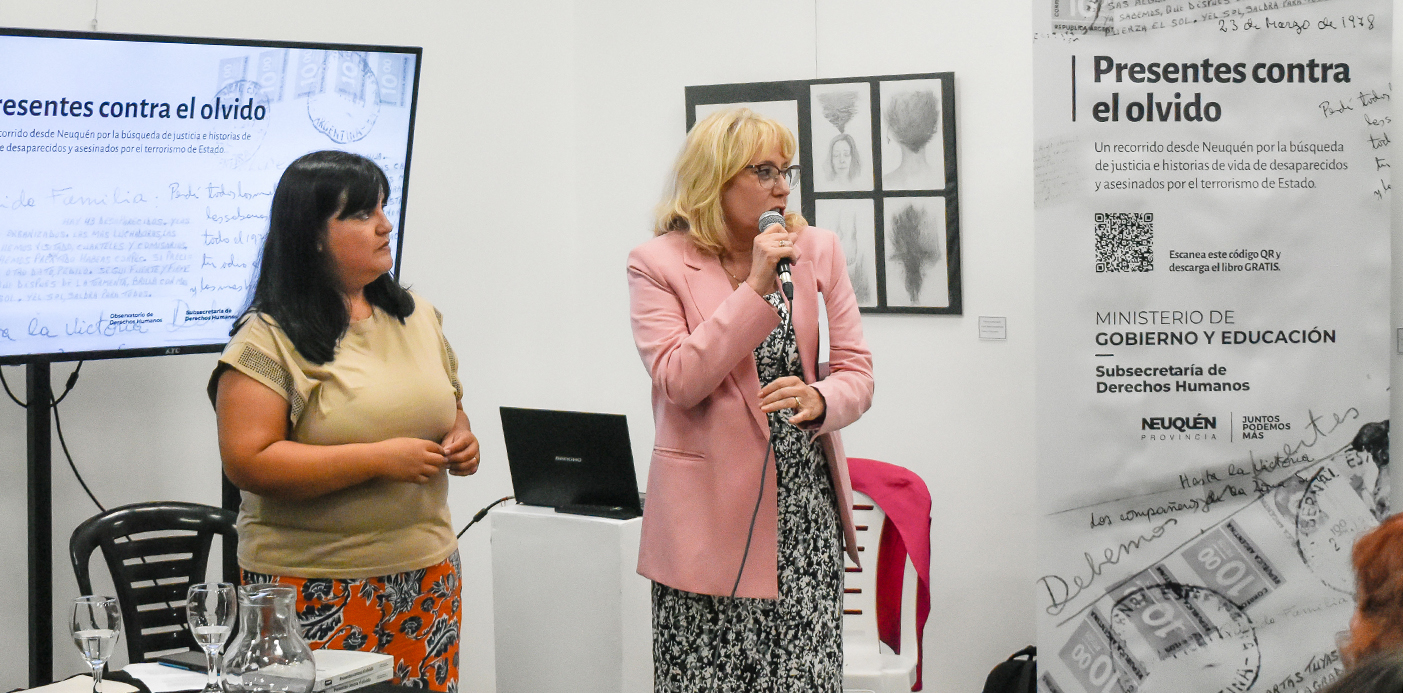 Se presentó ayer en el Centro Cultural Alberdi de Neuquén el libro “Presentes Contra el Olvido”, elaborado por el Observatorio de Derechos Humanos de la subsecretaría de Derechos Humanos de la provincia, que depende del ministerio de Gobierno y Educación.