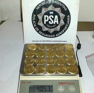 Por su parte, en la valija había otras 20 monedas de oro, informaron fuentes de la PSA.